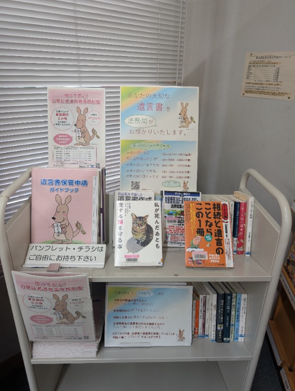 ガイドブックやチラシ、遺言書に関連する書籍を展示していますので是非ご覧ください。